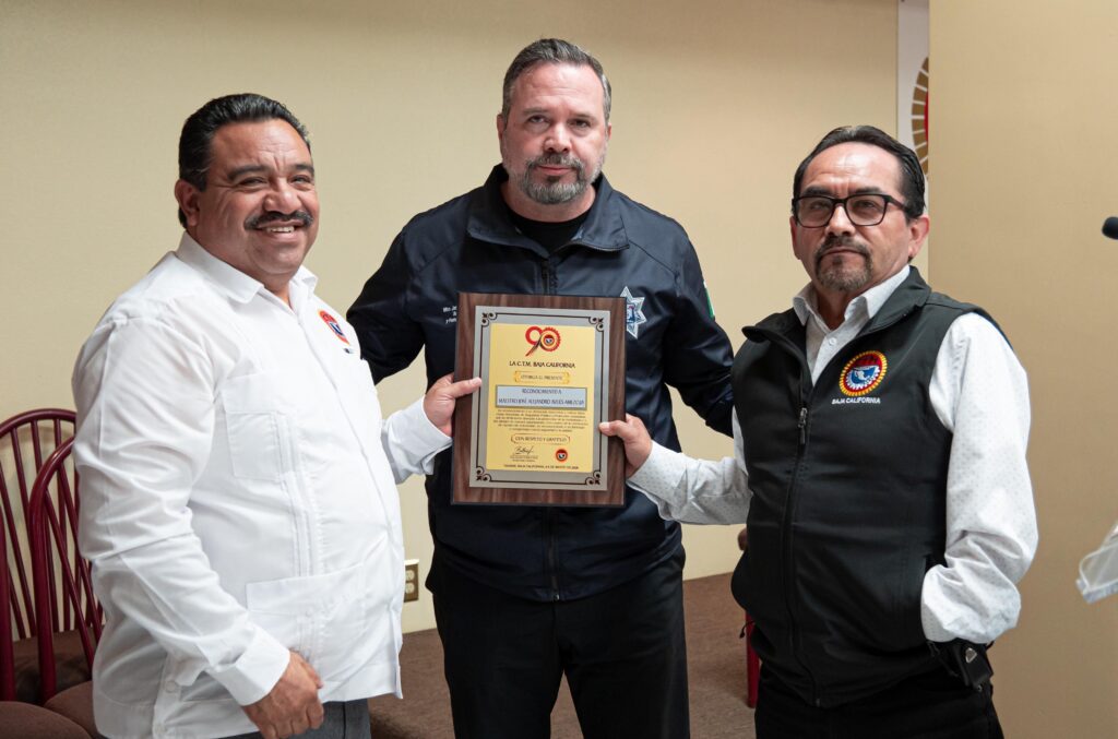 Tijuana, Baja California, 6 de marzo de 2026.— El presidente municipal de Tijuana, Ismael Burgueño Ruiz, asistió a la ceremonia en la que la Confederación de Trabajadores de México (CTM) en Baja California entregó un reconocimiento al titular de la Secretaría de Seguridad y Protección Ciudadana Municipal de Tijuana, José Alejandro Avilés Amezcua, por su trayectoria y labor al frente de la corporación.