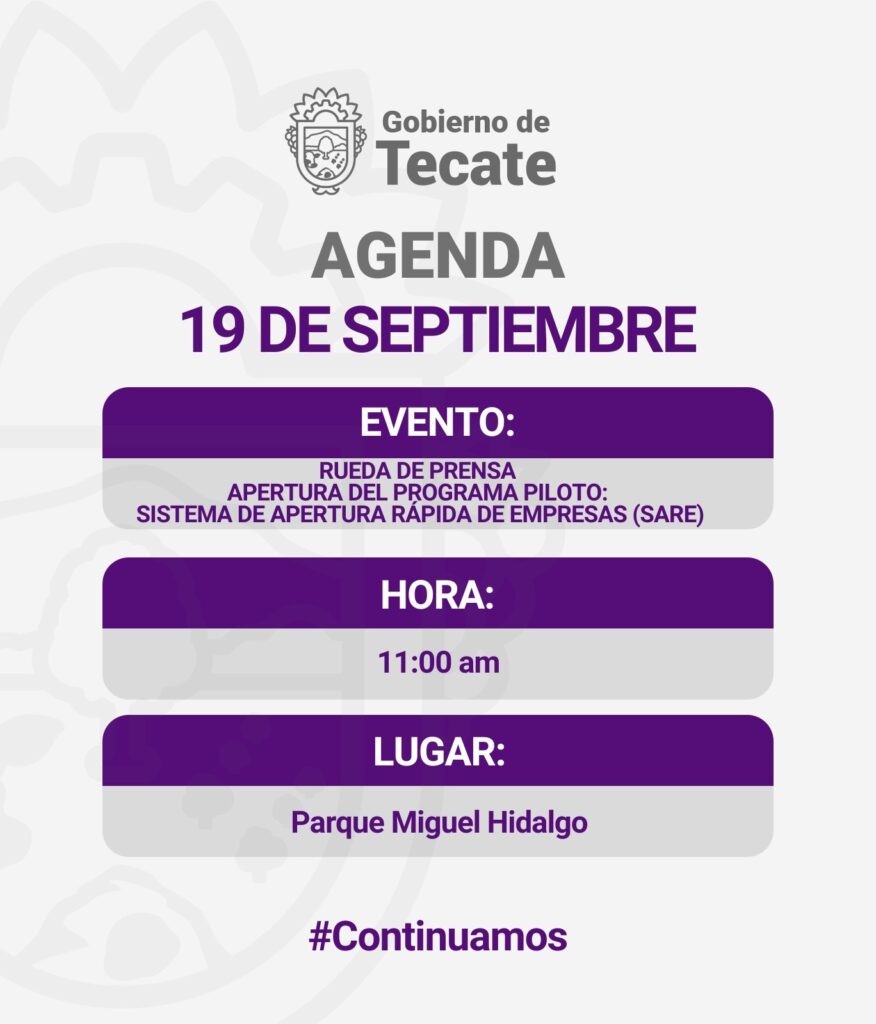 Tecate, Baja California. – El Gobierno que encabeza el presidente municipal Darío Benítez, convoca a medios de comunicación, cámaras locales, emprendedores y comunidad en general, este jueves 19 de septiembre a las 11:00 horas en el Parque Miguel Hidalgo, a la apertura del Programa Piloto SARE.