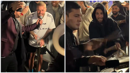 De un momento para otro, el cantante se acercó al músico que estaba tocando la tambora, tomó unas baquetas y comenzaron a tocar juntos.